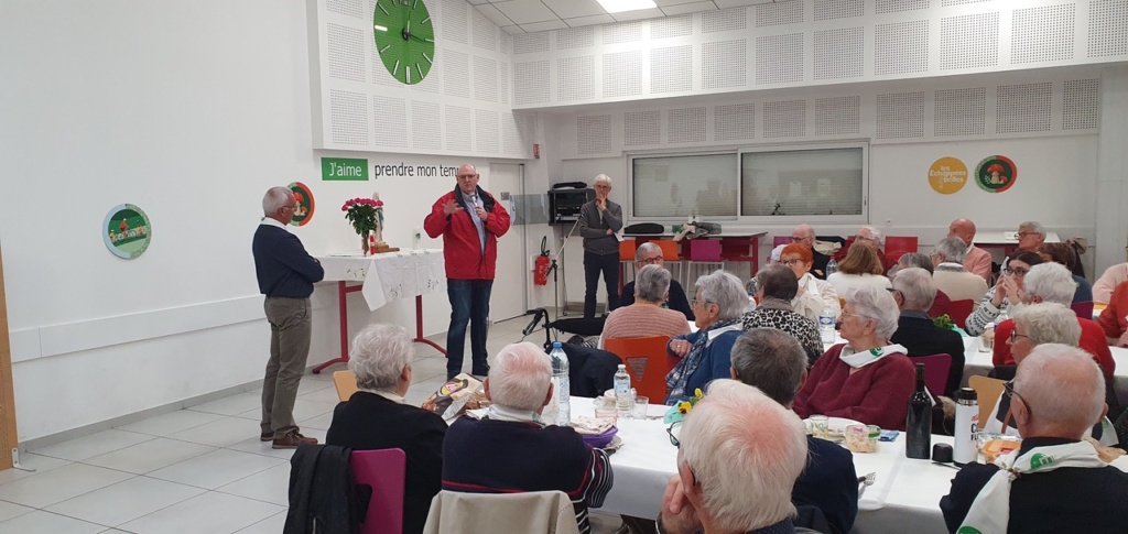 Nous avons débuté la journée par la messe en l’église St Vincent, elle a été concélébrée par Don Martin Bonnassieux, notre aumônier Stéphane Poirier et un prêtre de passage dans la paroisse Notre Dame en Aubance. Deux diacres étaient également présents, dont Jean Paul Sautejeau de notre délégation. Moment de recueillement et de pensées vers les personnes qui n’ont pas pu venir et celles décédées.
