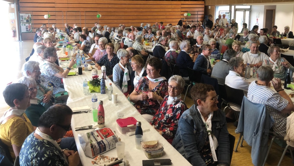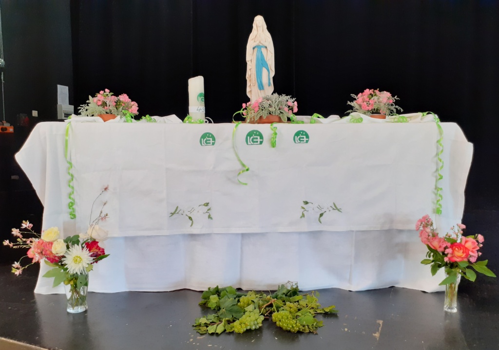 Puis nous avons rejoint une grande salle communale, gracieusement prêtée à notre association. Les tables avaient été joliment dressées par l’équipe locale, ainsi qu’un petit oratoire où Notre-Dame de Lourdes était à l’honneur.